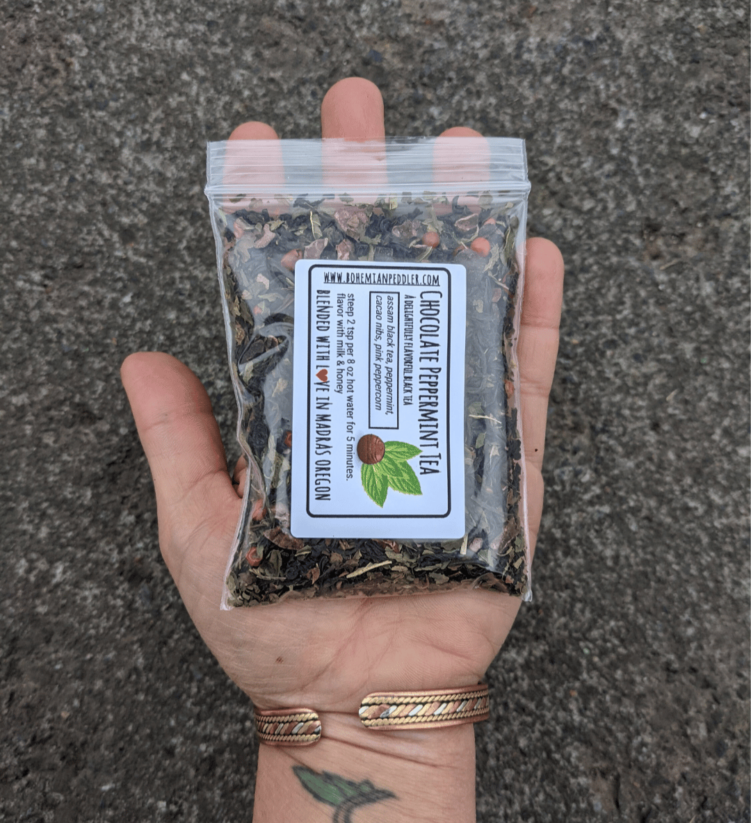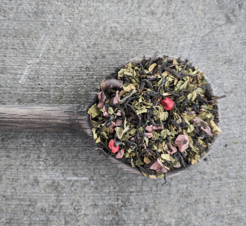 made with Assam Black tea, peppermint leafs, cacao nibs, pink peppercorns. Contains caffeine.