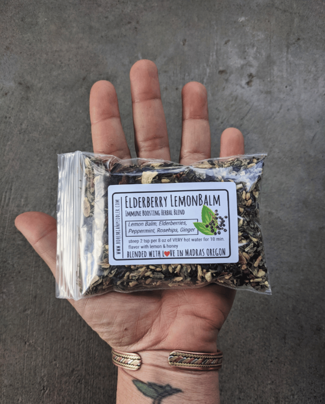 Ingredients: elderberries, lemon balm, peppermint, ginger, rosehips, yarrow.