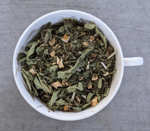 Ingredients ~ spearmint leaf, peppermint leaf, lemon balm, whole leaf lemon verbena, lemon peel. This herbal tea (tisane) is naturally caffeine free.