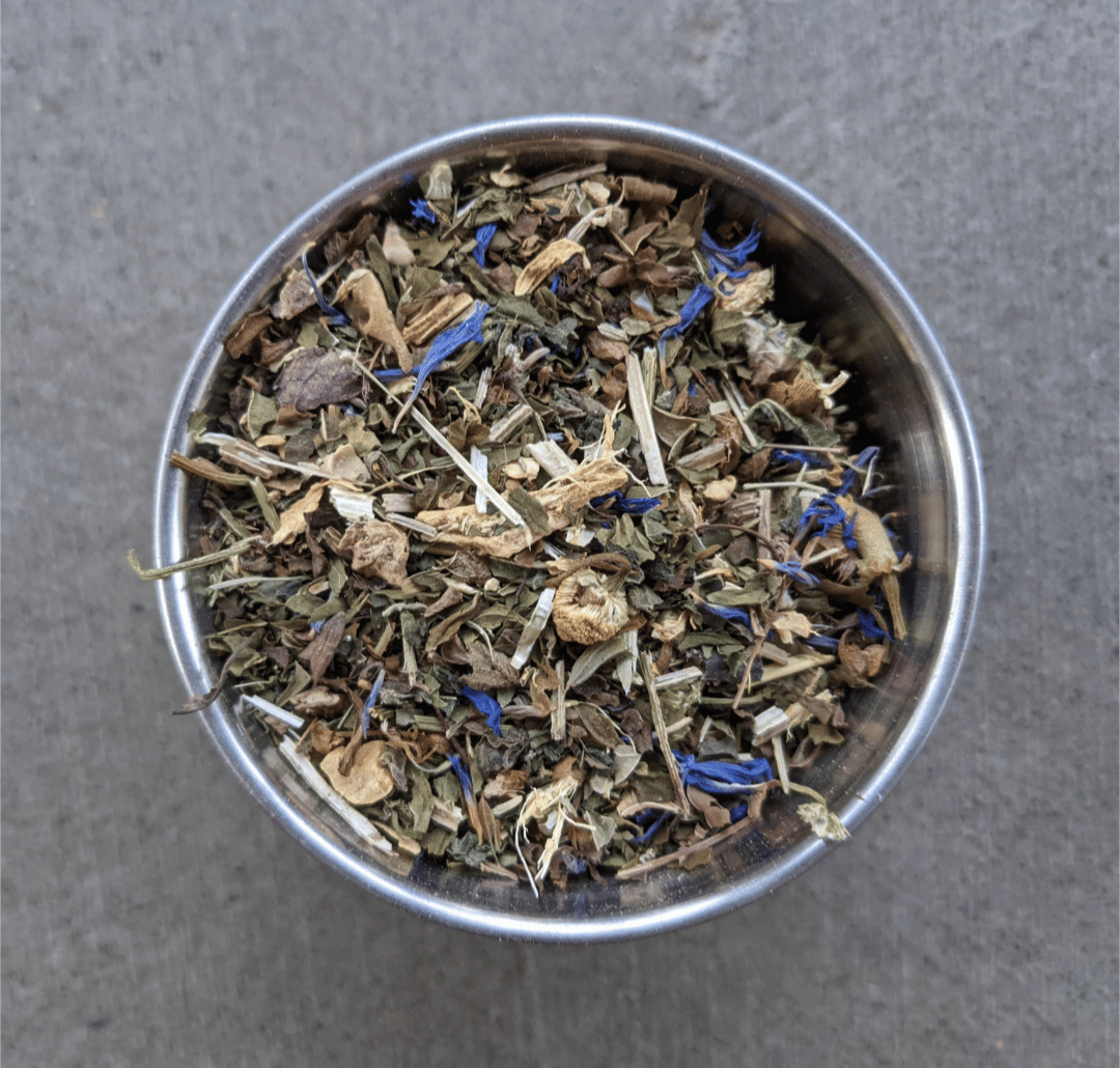 Ingredients: peppermint, tulsi (holy basil), blue vervain, California poppy, chamomile, oat straw, nettles, skullcap, lemon balm, ginger, & cornflower petals